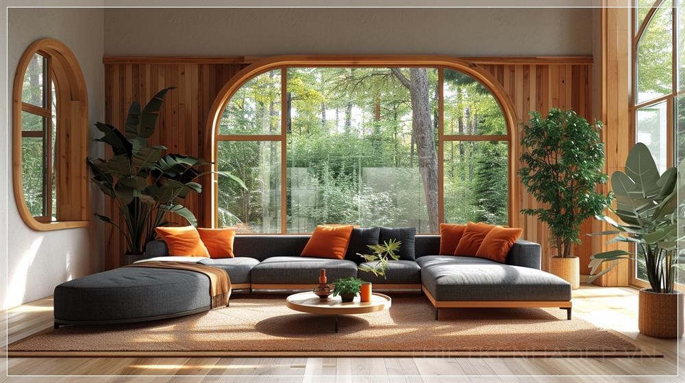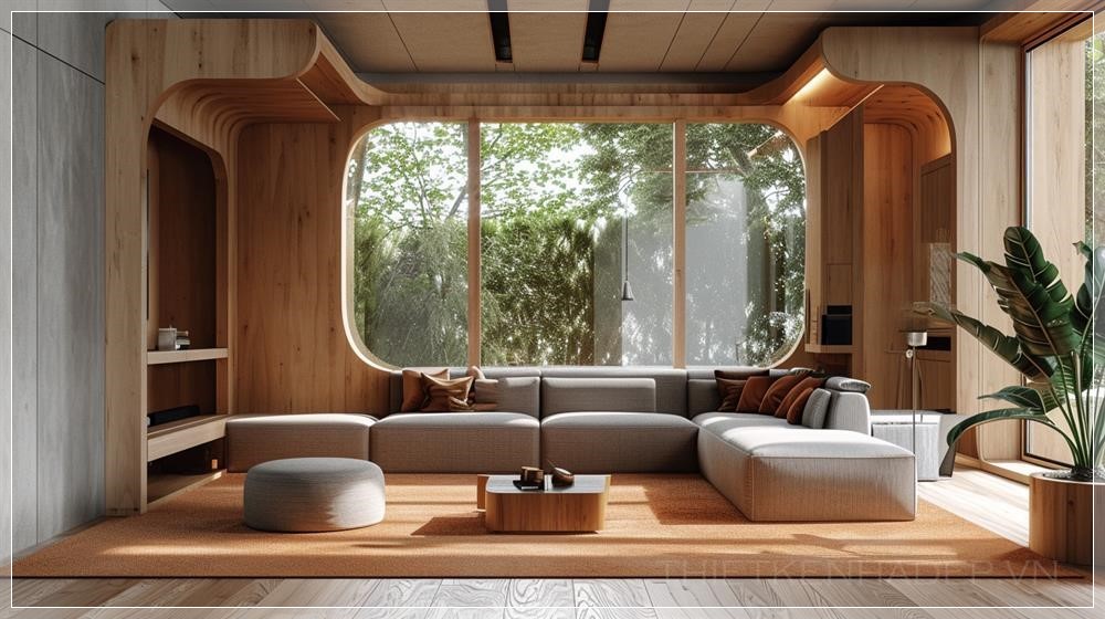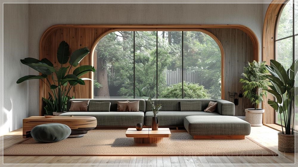 h. R. giger and beksinski, highly detailed, vibrant, production cinematic character rendering, ultra high quality model, excellent sofa photorealistic modern bohem living room into the room towards the window a photorealistic modern wood bohem living room with rounded corners, a wooden frame --ar 16:9 --style raw --stylize 750 --v 6.0 --no sofa ::1 sofa::-1
