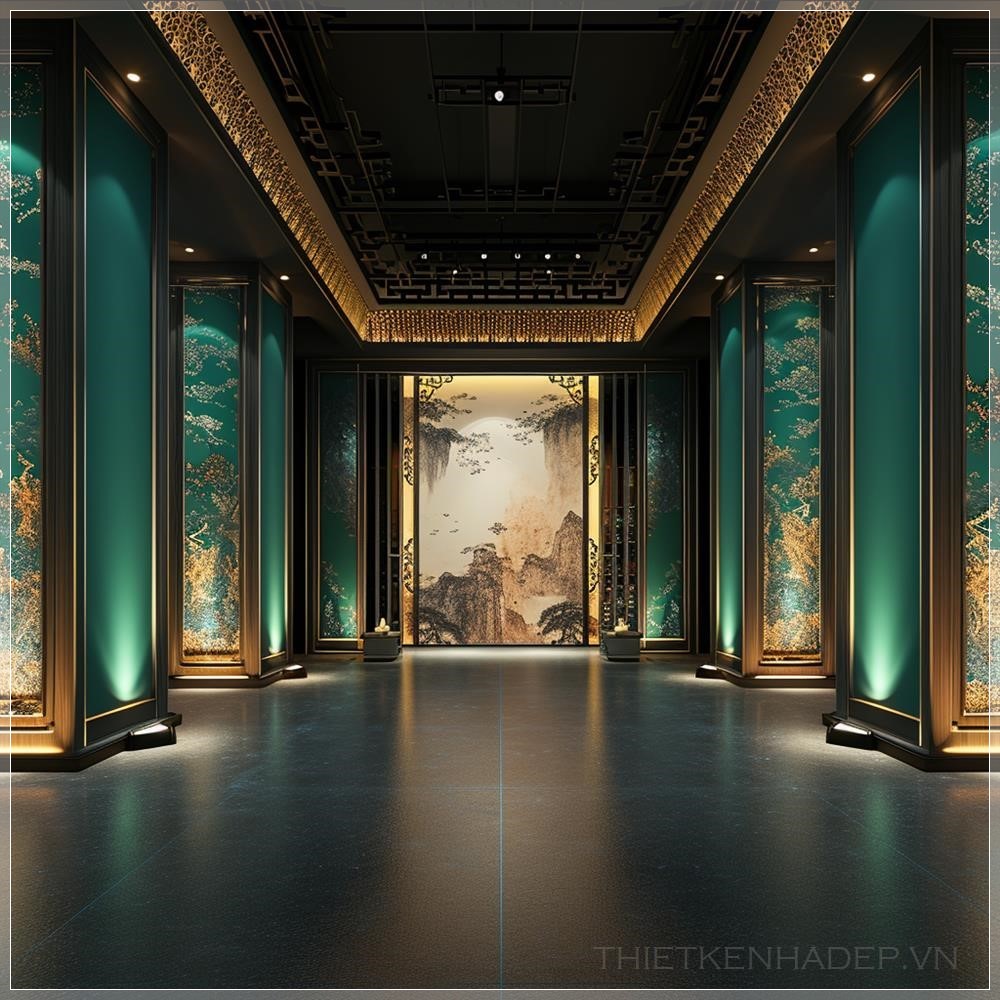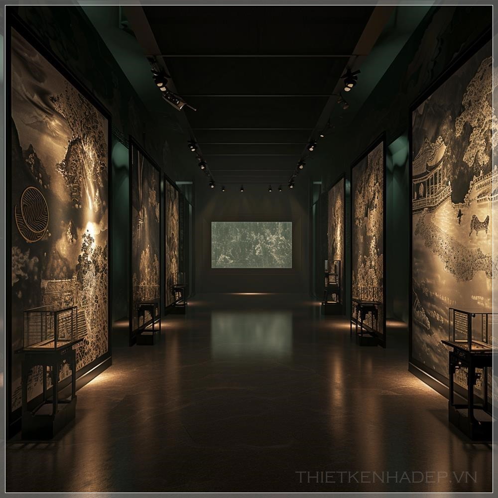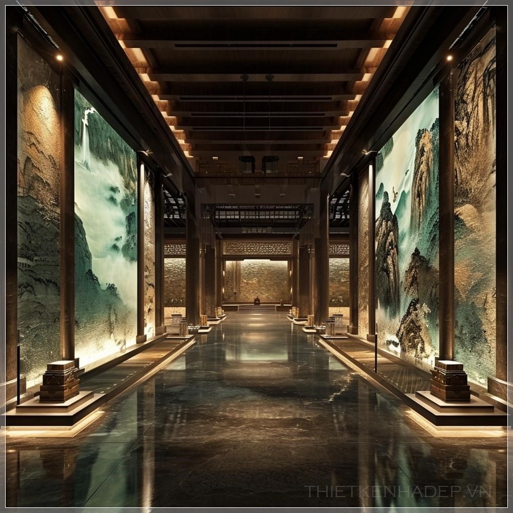 PROMPT: Chinese style design exhibition hall, natural color, green mining style, incorporating Chinese ancient decorative elements, with screen projection on both sides and dim ambient light --v 6.0 Ý Nghĩa: