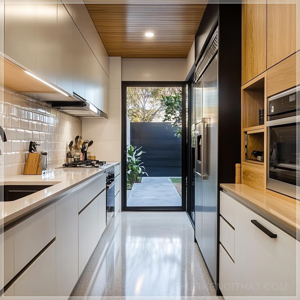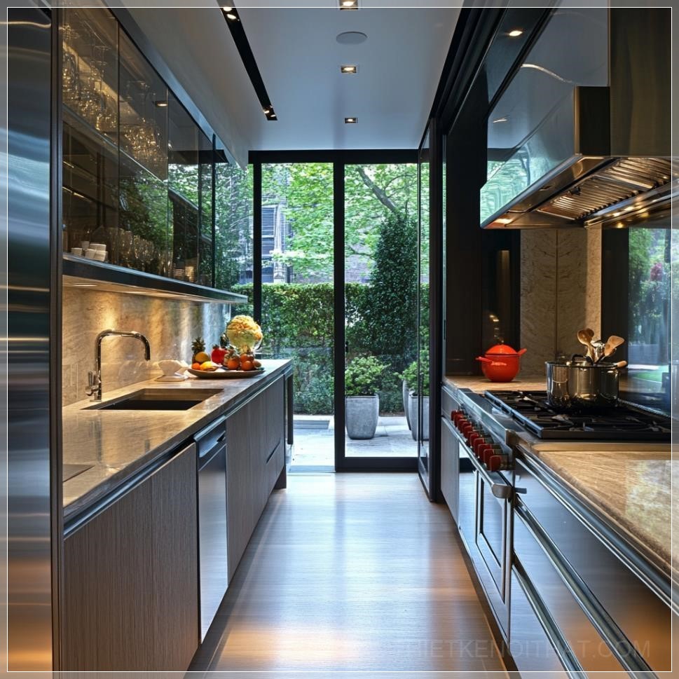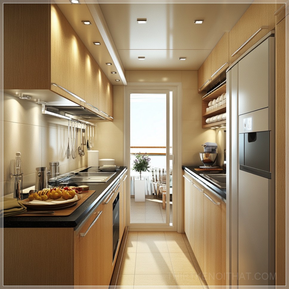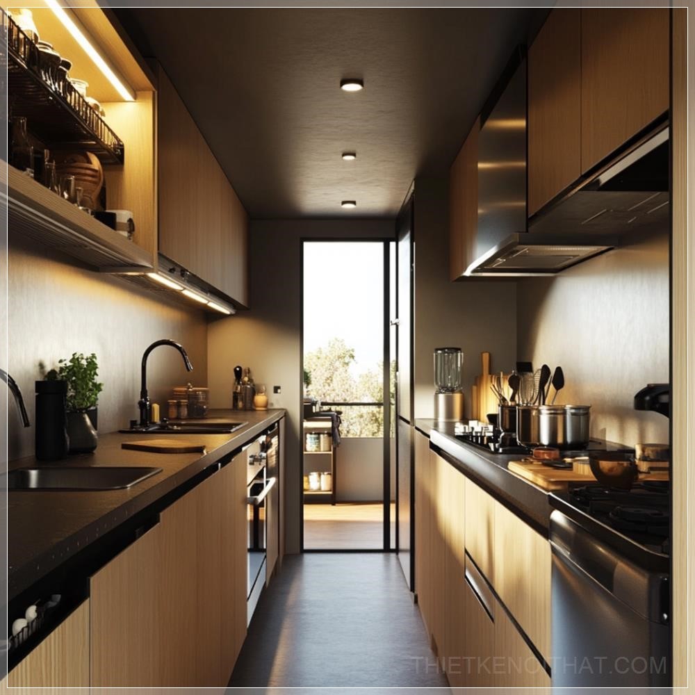 PROMPT: realistic galley kitchen showing its efficiency --v 6.1 Ý Nghĩa: Nhà bếp galley thực tế cho thấy sự hiệu quả của nó.
