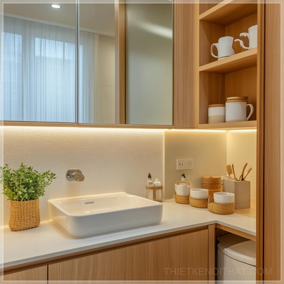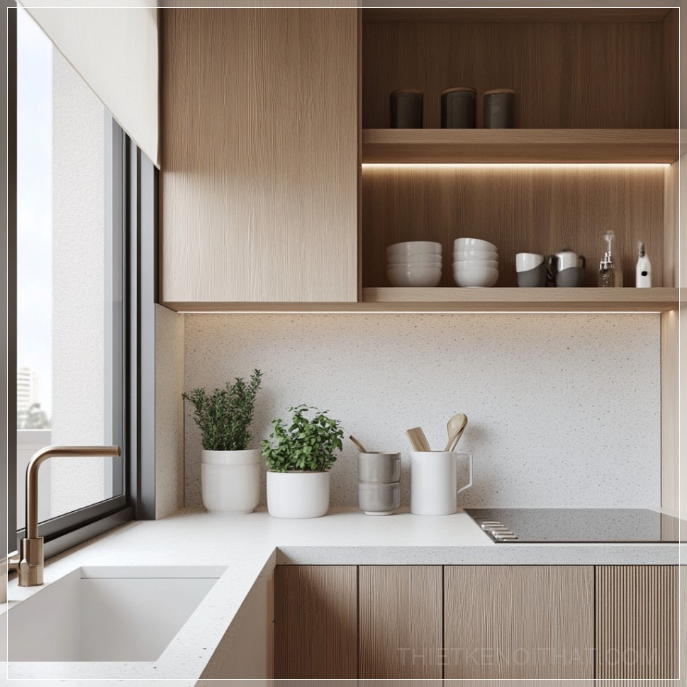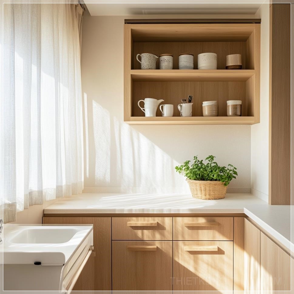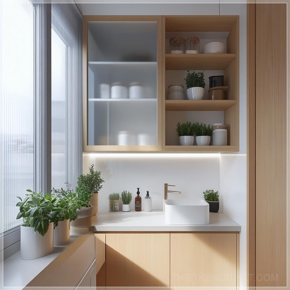 Một không gian kết hợp nhà vệ sinh và bếp theo phong cách Bắc Âu hài hòa. Trong khu vực vệ sinh, một chiếc bồn cầu gỗ sơn trắng với thiết kế tối giản, thanh lịch chiếm vị trí trung tâm. Các đường nét mượt mà và hình dáng đơn giản của nó hòa hợp hoàn hảo với thẩm mỹ chung của không gian. Những bức tường của buồng vệ sinh được làm từ kính mờ bán trong suốt, màu sáng, không chỉ đảm bảo sự riêng tư mà còn cho phép ánh sáng tự nhiên nhẹ nhàng chiếu vào, tạo ra một không gian sáng sủa và thoáng đãng. Cửa của buồng vệ sinh là cửa trượt gỗ có tông màu sáng, với phần cứng tối giản mang đến vẻ đẹp gọn gàng, sạch sẽ. Liền kề với nhà vệ sinh là khu vực bếp, nơi một chiếc tủ hình chữ L thu hút sự chú ý. Được làm từ gỗ tự nhiên không nút với màu sáng, chiếc tủ toát lên sự ấm áp và ấm cúng. Cửa tủ là kiểu phẳng, với tay nắm chìm, hoàn thiện bằng hợp kim niken đánh bóng mang lại sự thanh lịch. Mặt bàn của tủ chữ L là đá quartz màu sáng, có đốm màu xám nhạt, với bề mặt mịn màng và độ bền cao, có thể chịu được sự sử dụng hàng ngày. Trên mặt bàn, các kệ gỗ kiểu mở với màu gỗ nhuộm sáng, tông màu mật ong được lắp đặt. Những kệ này được trang trí bằng một bộ sưu tập các cốc sứ thiết kế đơn giản nhưng sống động, có nhiều tông màu đất khác nhau. Trong đó, các chậu cây thảo mộc nhỏ như húng quế, cỏ xạ hương và mùi tây thêm vào một cảm giác tươi mới và sinh động, mang lại một chút thiên nhiên cho không gian. Dưới mặt bàn, các ngăn kéo sâu có cơ chế đóng chậm, lý tưởng để lưu trữ dụng cụ nấu ăn, nồi niêu và chảo. Chậu rửa bếp là một mẫu chậu sứ trắng, sâu và rộng, được lắp chìm dưới mặt bàn. Kết hợp với vòi nước dạng cần cong hoàn thiện bằng hợp kim niken đánh bóng, tạo ra vẻ đẹp và sự tiện dụng, dễ dàng di chuyển khi rửa chén bát. Trên chậu rửa, một cửa sổ lớn, hình chữ nhật với khung gỗ màu sáng mang đến một khung cảnh dễ thương và làm tràn ngập không gian với ánh sáng tự nhiên. Cửa sổ được trang trí bằng rèm voan trắng đơn giản, nhẹ nhàng bay trong gió, tạo thêm cảm giác mềm mại. Sàn nhà trong toàn bộ khu vực vệ sinh - bếp được lát bằng những tấm gỗ rộng, màu sáng, bố trí theo kiểu herringbone cổ điển. Điều này không chỉ tuân theo thẩm mỹ Bắc Âu mà còn tạo ra một bề mặt ấm áp và thoải mái dưới chân. Tường được sơn màu xám nhạt, mang lại một nền trung tính, dễ dàng phối hợp với các yếu tố khác. Các thiết bị chiếu sáng là sự kết hợp của sự đơn giản và tính chức năng. Đèn treo với chao đèn kim loại sơn trắng treo trên mặt bàn bếp, phát ra ánh sáng ấm áp, nhẹ nhàng, trong khi các đèn âm trần trên trần nhà cung cấp ánh sáng đều, chiếu sáng không gian cả ngày lẫn đêm. Ngoài ra, một vài đèn LED dải nhỏ gắn trên tường dưới các kệ mở thêm phần hiện đại và làm nổi bật các vật dụng được trưng bày.