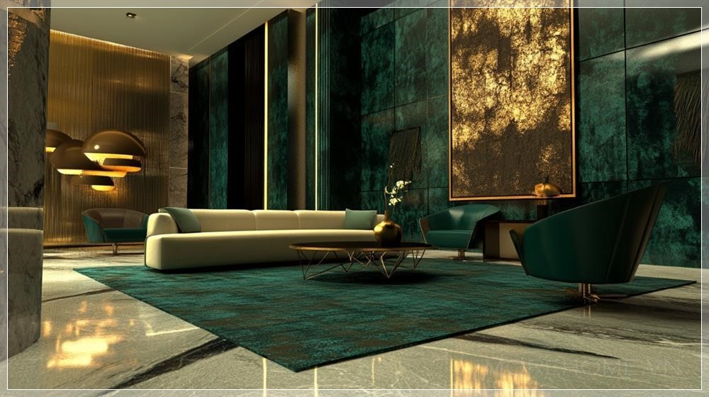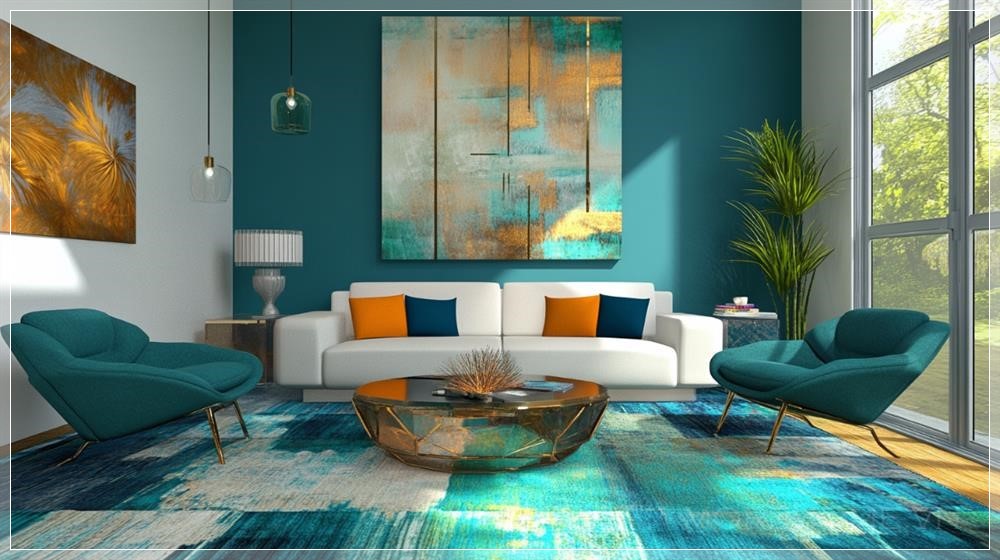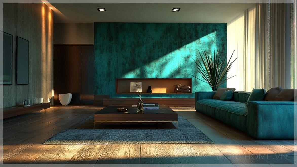 modern contemporary interior design, living room, minimal , teal and gold, --ar 16:9