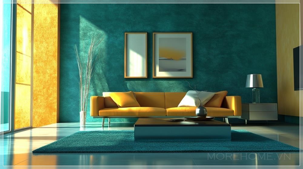Thiết kế nội thất hiện đại với không gian phòng khách mang phong cách tối giản, kết hợp giữa màu xanh lam và vàng. Màu sắc này tạo nên một không gian sang trọng, nhẹ nhàng và đầy phong cách, làm nổi bật vẻ đẹp tinh tế của không gian sống.