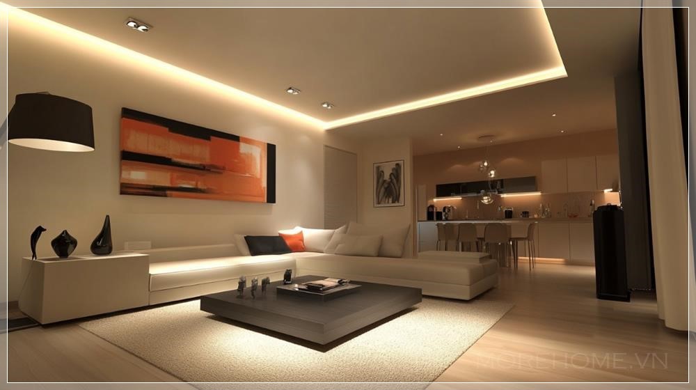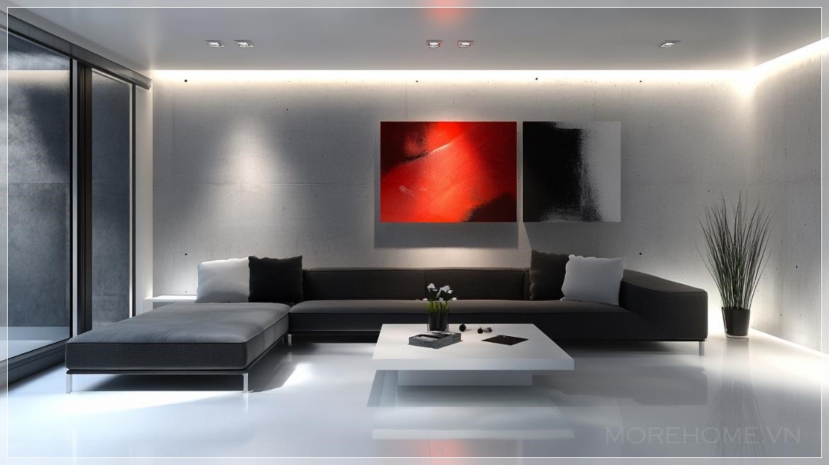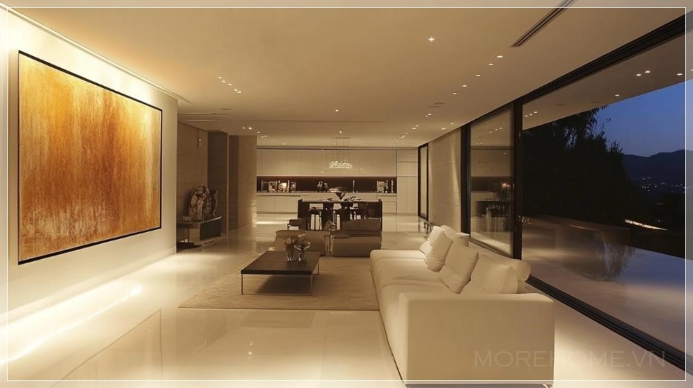 Trong phòng khách, sử dụng đồ nội thất thấp gọn gàng với trang trí tối giản, nghệ thuật trừu tượng và ánh sáng ẩn để tạo không gian sang trọng và tinh tế. Tất cả đều hướng tới sự đơn giản, nhưng vẫn mang lại cảm giác hiện đại và thoải mái.