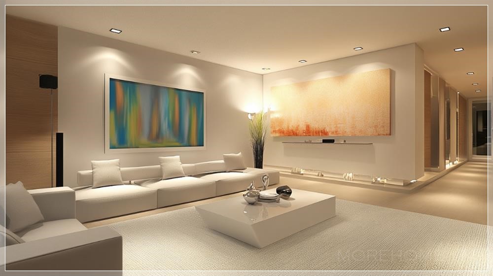 Design a modern minimalist home interior In the living room, use sleek low-profile furniture with minimal decor, abstract art, and recessed lighting --ar 16:9 --v 6.1