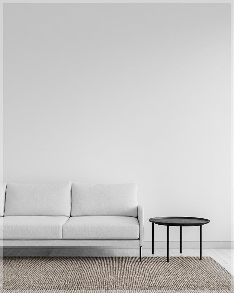 White sofa and coffee table against an empty solid white wall wall in a living room, a minimalistic interior design of a modern home entrance or new apartment. Simple wooden floor with a woven rug. Close-up view of minimalist decor. Minimalist aesthetic. Photo taken on a Canon R5, f/2.8. --ar 4:5 --v 6.1