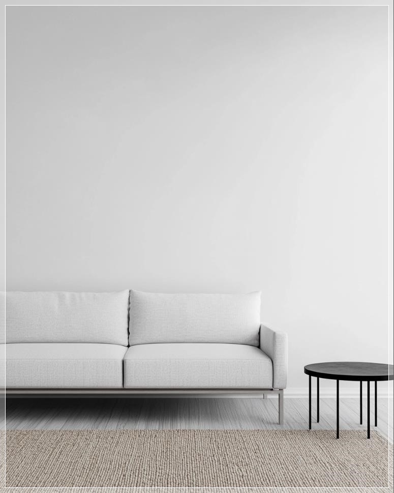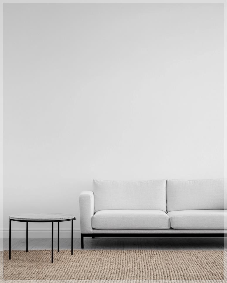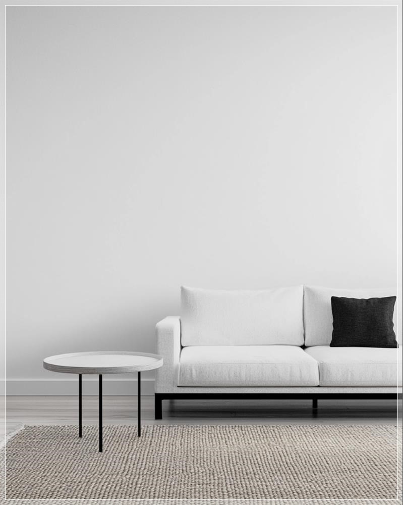 Sofa trắng và bàn cà phê đặt gần một bức tường trắng trơn trong phòng khách, là thiết kế nội thất tối giản của một căn hộ mới hoặc lối vào ngôi nhà hiện đại. Sàn gỗ đơn giản với tấm thảm đan. Cảnh quay gần về thiết kế tối giản, tạo nên thẩm mỹ hiện đại. Ảnh được chụp bằng Canon R5, f/2.8.