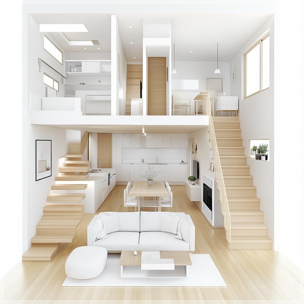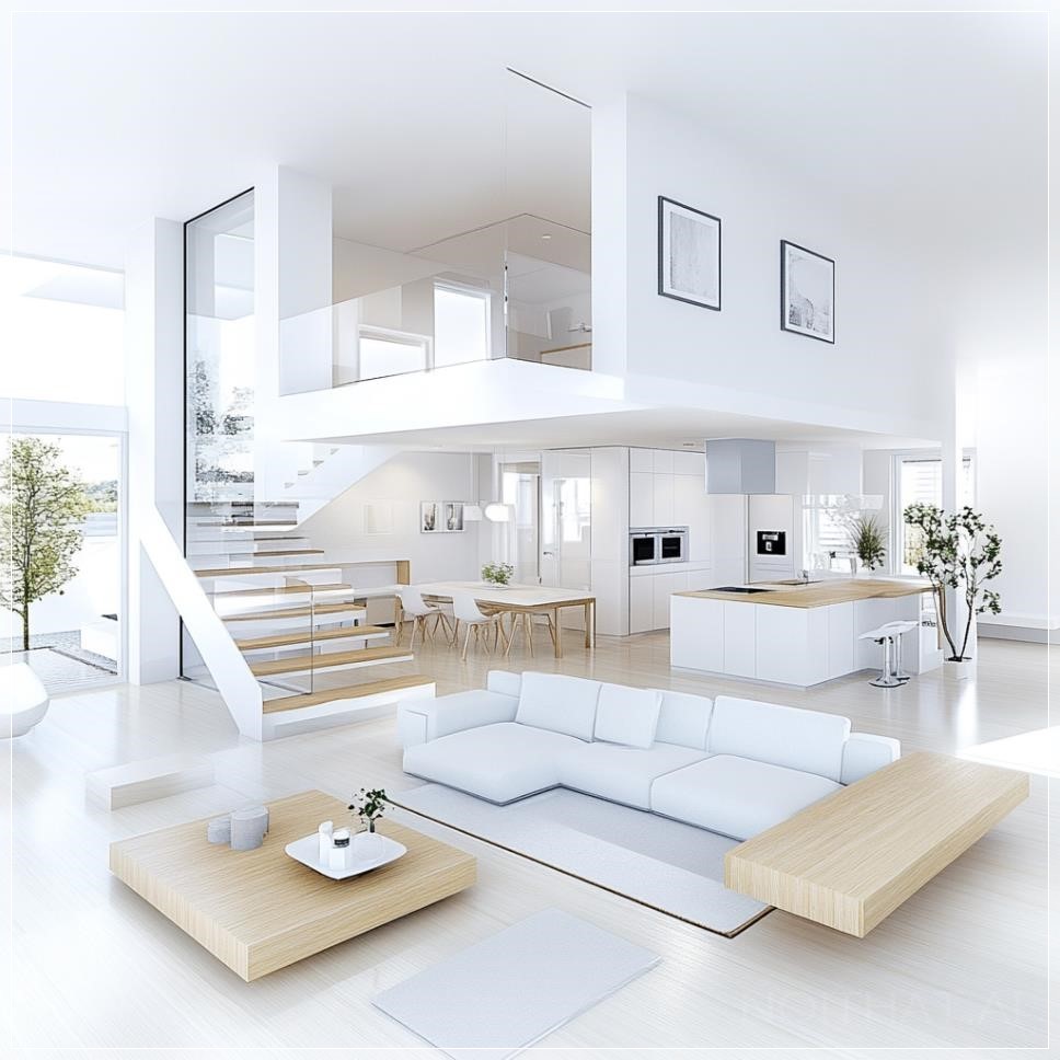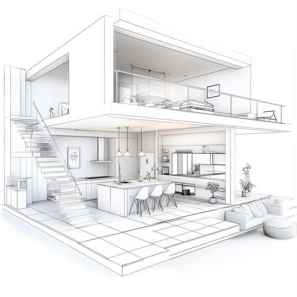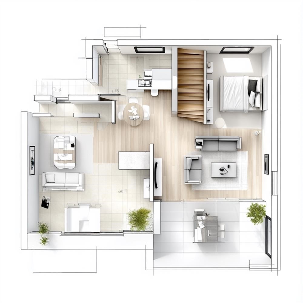 Thiết kế mặt bằng tầng trệt của ngôi nhà hiện đại với phong cách tối giản, bao gồm một phòng bếp và phòng ăn rộng rãi, một phòng làm việc cho các hoạt động văn phòng tại nhà và một WC nhỏ nhưng hiệu quả. Kế hoạch còn có cầu thang dẫn lên tầng hai, nằm gần hành lang chính. Các đường nét rõ ràng và phong cách thiết kế sạch sẽ, với sự liên kết mở giữa phòng bếp và phòng ăn, đồng thời duy trì không gian riêng biệt cho phòng làm việc và WC.