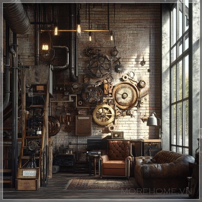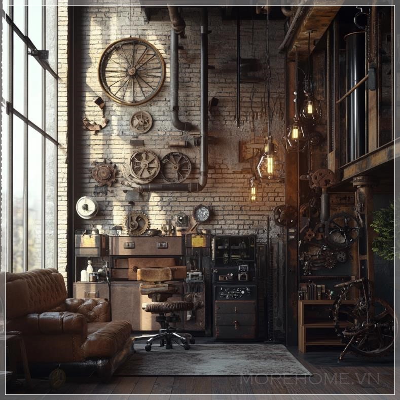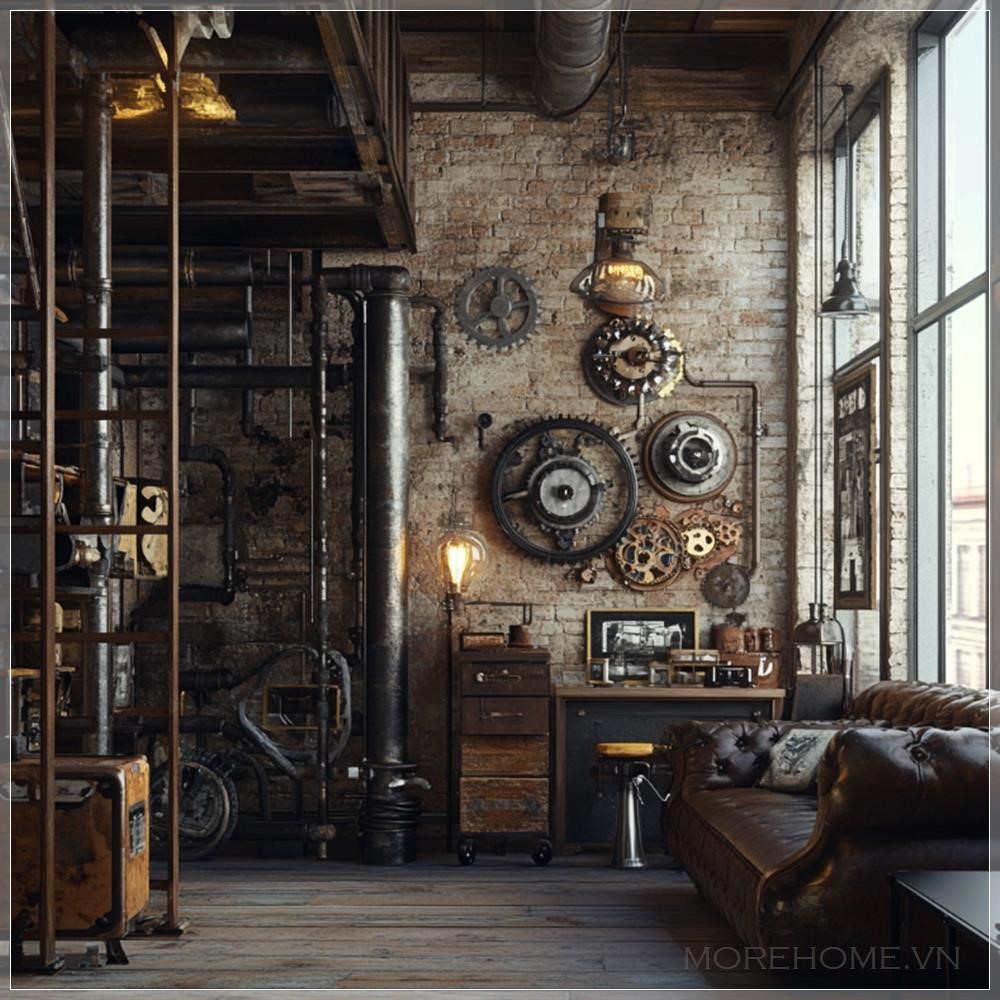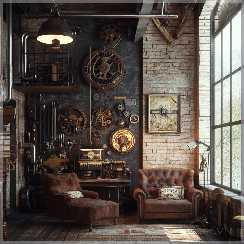 Tạo hình một căn phòng mang phong cách cổ điển, kết hợp với các chi tiết cơ khí như pít-tông, bánh răng, các bộ phận xe đạp, bóng đèn cổ và những yếu tố tương tự để tạo nên một không gian vừa hoài niệm vừa độc đáo, mang đậm chất nghệ thuật cơ khí.