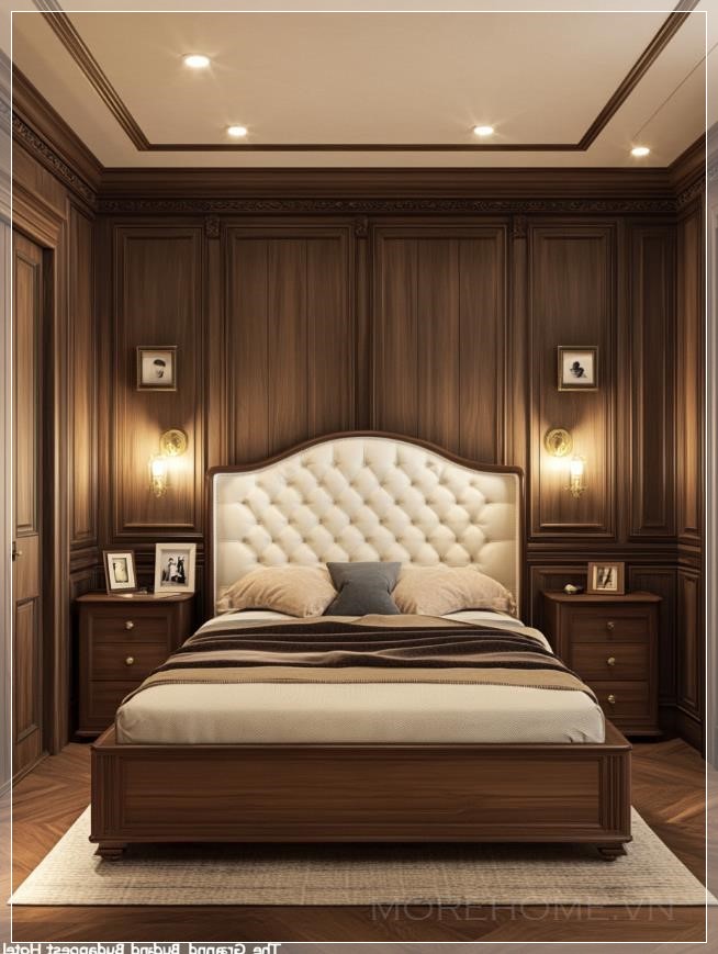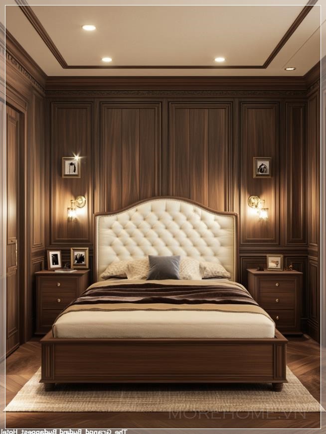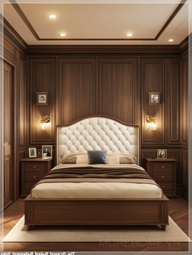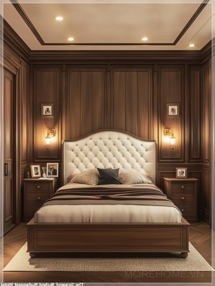 Đây là thiết kế phòng ngủ mang đậm nét quyến rũ thời trung cổ, kết hợp giữa tính thực dụng và vẻ đẹp cao cấp, lấy cảm hứng từ thẩm mỹ hoài cổ của bộ phim The Grand Budapest Hotel. Bố cục đối xứng được áp dụng với hai cánh cửa ở hai bên giường – một dẫn ra hành lang, một dẫn vào phòng thay đồ – tạo nên sự cân bằng và hài hòa về mặt thị giác. Tủ quần áo âm tường toàn bộ được thiết kế riêng để đáp ứng nhu cầu lưu trữ lớn, kết hợp với không gian chứa đồ trong phòng thay đồ giúp giải quyết triệt để vấn đề lưu trữ. Đầu giường bằng da trắng tạo sự tương phản rõ nét với sàn gỗ óc chó sẫm màu và tường ốp gỗ nâu đậm, mang lại cảm giác ấm áp và có chiều sâu. Hai bên đầu giường được bố trí đèn ngủ, ánh sáng vàng dịu tỏa xuống đầu giường vừa tạo cảm giác sang trọng vừa cung cấp ánh sáng nhẹ nhàng vào ban đêm. Một khung ảnh vuông nhỏ đặt phía trên giường hoặc trên tủ gỗ, tăng thêm tính cá nhân và chiều sâu cho không gian. Đèn trần phát ra ánh sáng nhẹ nhàng, chiếu sáng toàn bộ căn phòng, tạo nên bầu không khí ấm cúng và dễ chịu. Cửa gỗ nâu và tường gỗ tiếp tục tôn lên nét cổ điển của phong cách trung cổ, đồng thời kết hợp khéo léo các yếu tố hiện đại để tạo nên một không gian ngủ vừa cổ điển vừa thoải mái. Toàn bộ thiết kế tinh tế và đầy chi tiết, như thể mỗi góc nhỏ đều chứa đựng một câu chuyện riêng, khiến người ta có cảm giác như đang bước vào một phân cảnh điện ảnh.