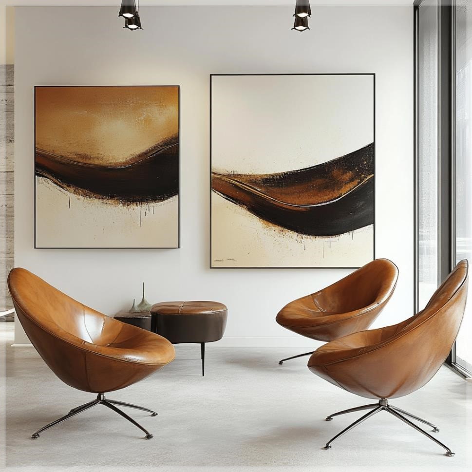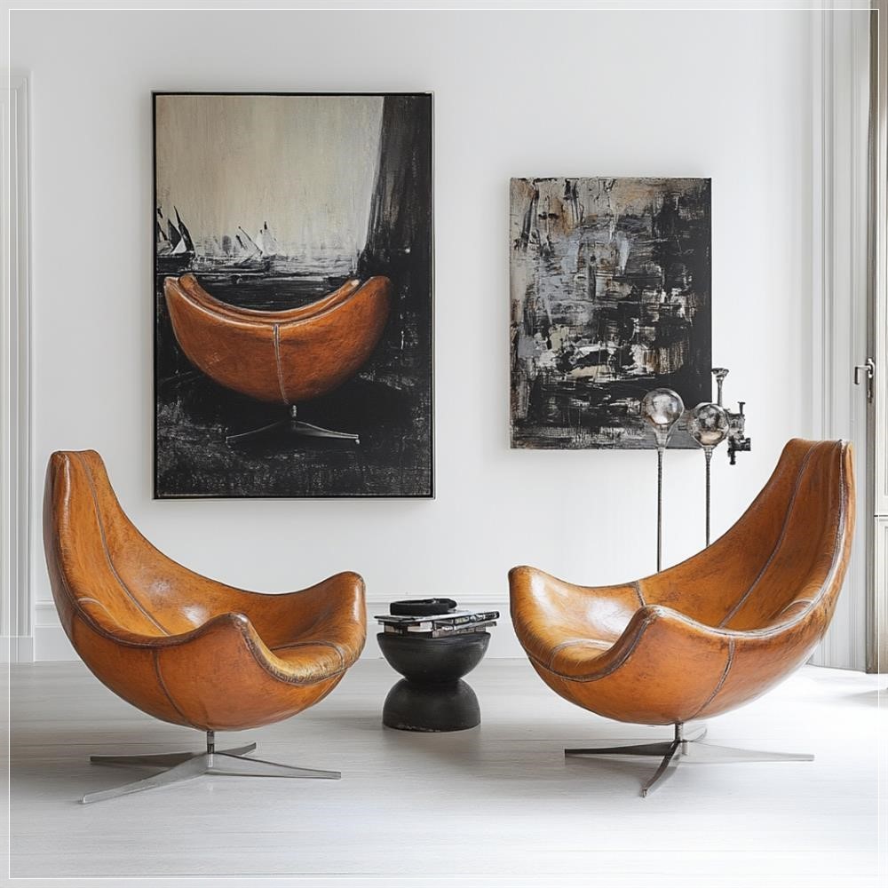 Clean and pure background, peculiar shape of soft leather chairs, metal legs, artwork, no clutter, bright light, white background