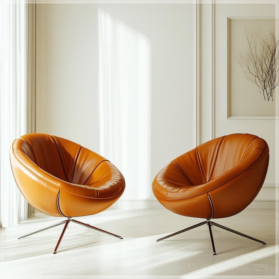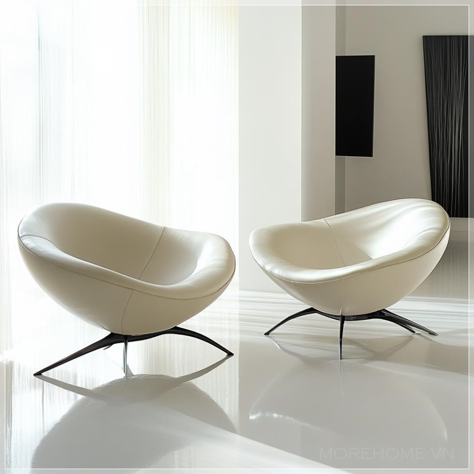 Mô tả một không gian nội thất hiện đại và tối giản, nơi mà các yếu tố như ghế da mềm, ánh sáng sáng và nền trắng hòa quyện với nhau tạo nên một không gian tinh tế, gọn gàng và đầy tính nghệ thuật, không có sự bừa bộn.