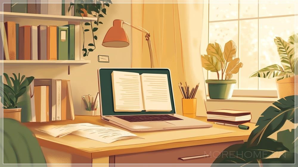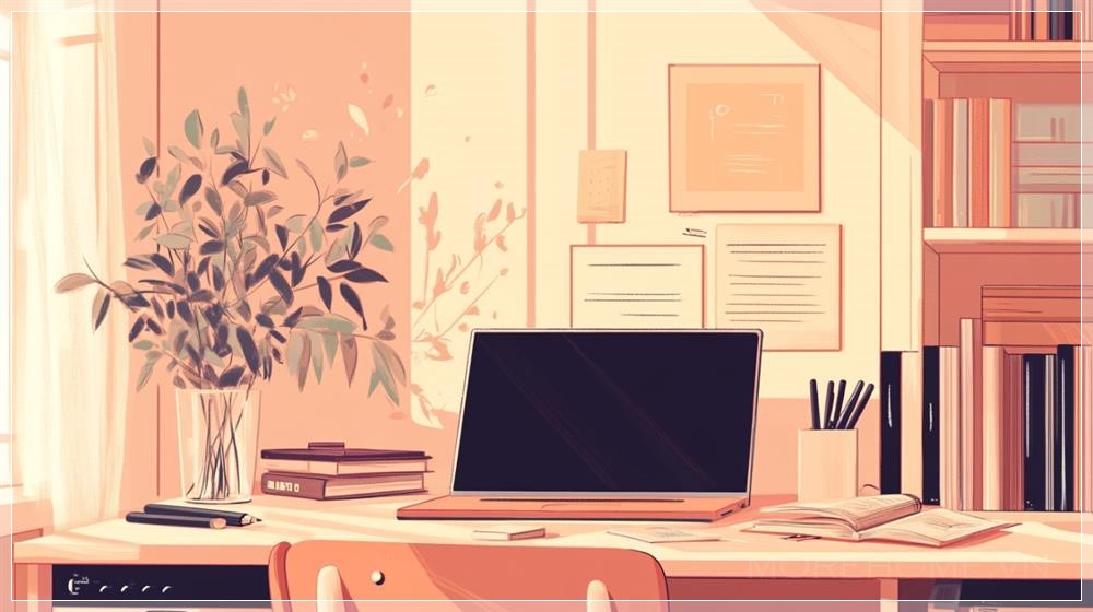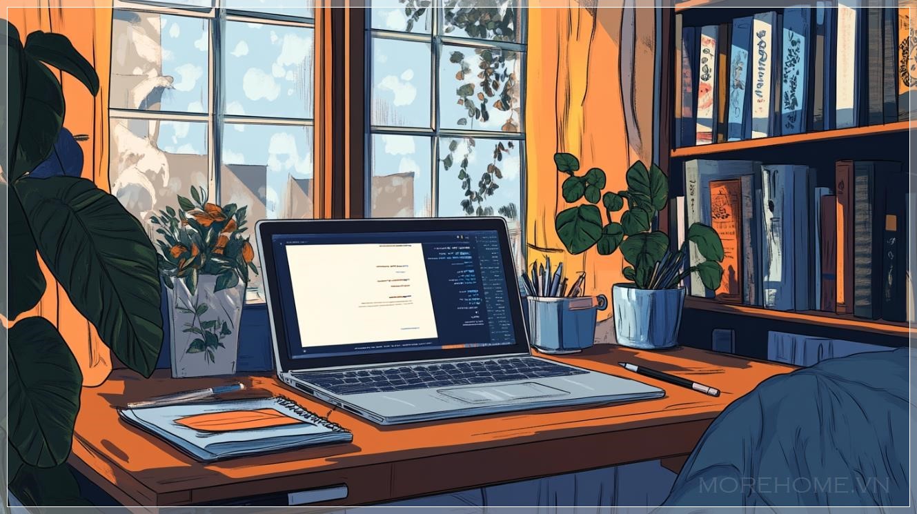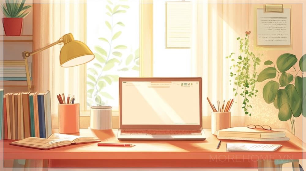 Tạo một hình nền thẩm mỹ cho không gian học tập ấm cúng dành cho sinh viên, bao gồm các vật dụng như laptop, sách và bút. Lấy cảm hứng từ không khí thư giãn, ấm áp của cô gái lofi.