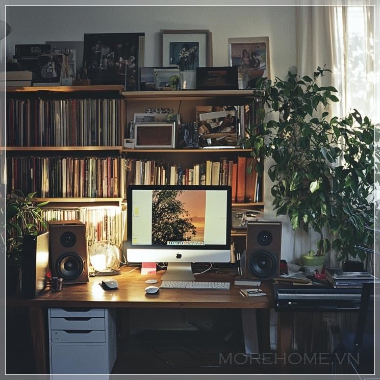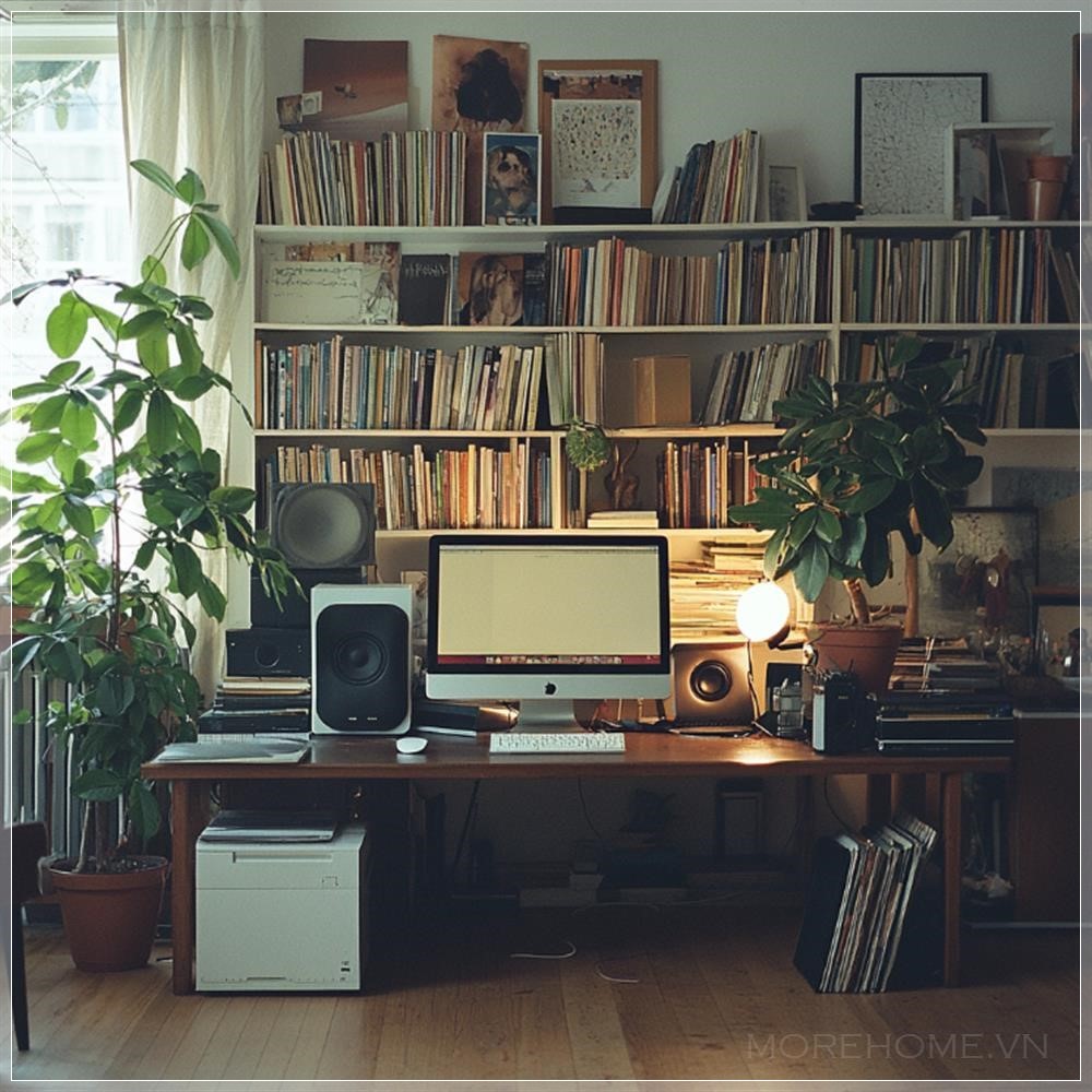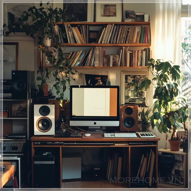 Ảnh chụp analog 35mm, chụp với đèn flash, phòng khách tối giản hiện đại với không gian sạch sẽ và ngăn nắp, có một vài cây cảnh phong cách, trang trí tinh tế, và một bộ máy tính để thu podcast. Cảnh vật thoáng đãng, bình yên với kết cấu phim hạt, ánh sáng ấm, đồ nội thất thanh lịch và các yếu tố đương đại, thể hiện một không gian sáng tạo, hợp thời trang với sự đơn giản và thanh lịch.