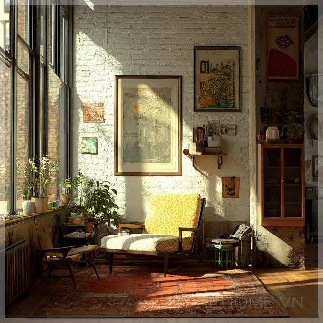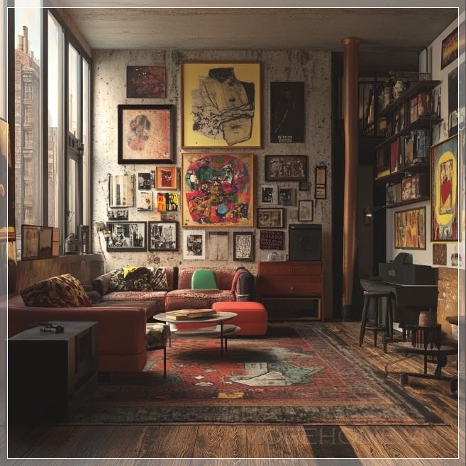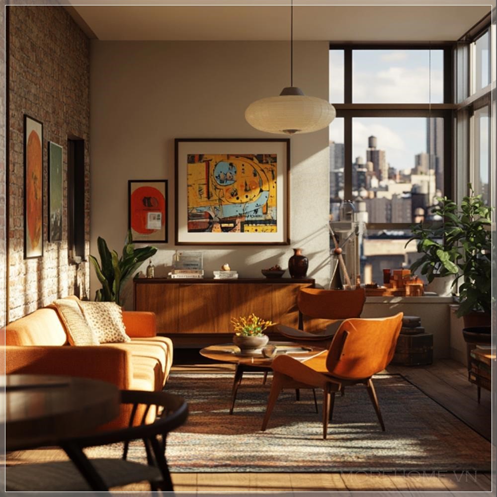 I need realistic, renderings of a very pop inspired, mid-century modern antique, Gothic, 700 square-foot mini apartment, and Soho, Manhattan, and how it is spaced, work, life, balance, healthy, attractive, space, or work on walls