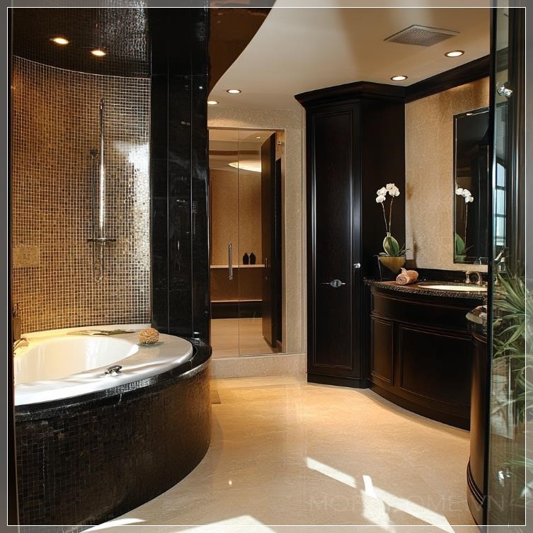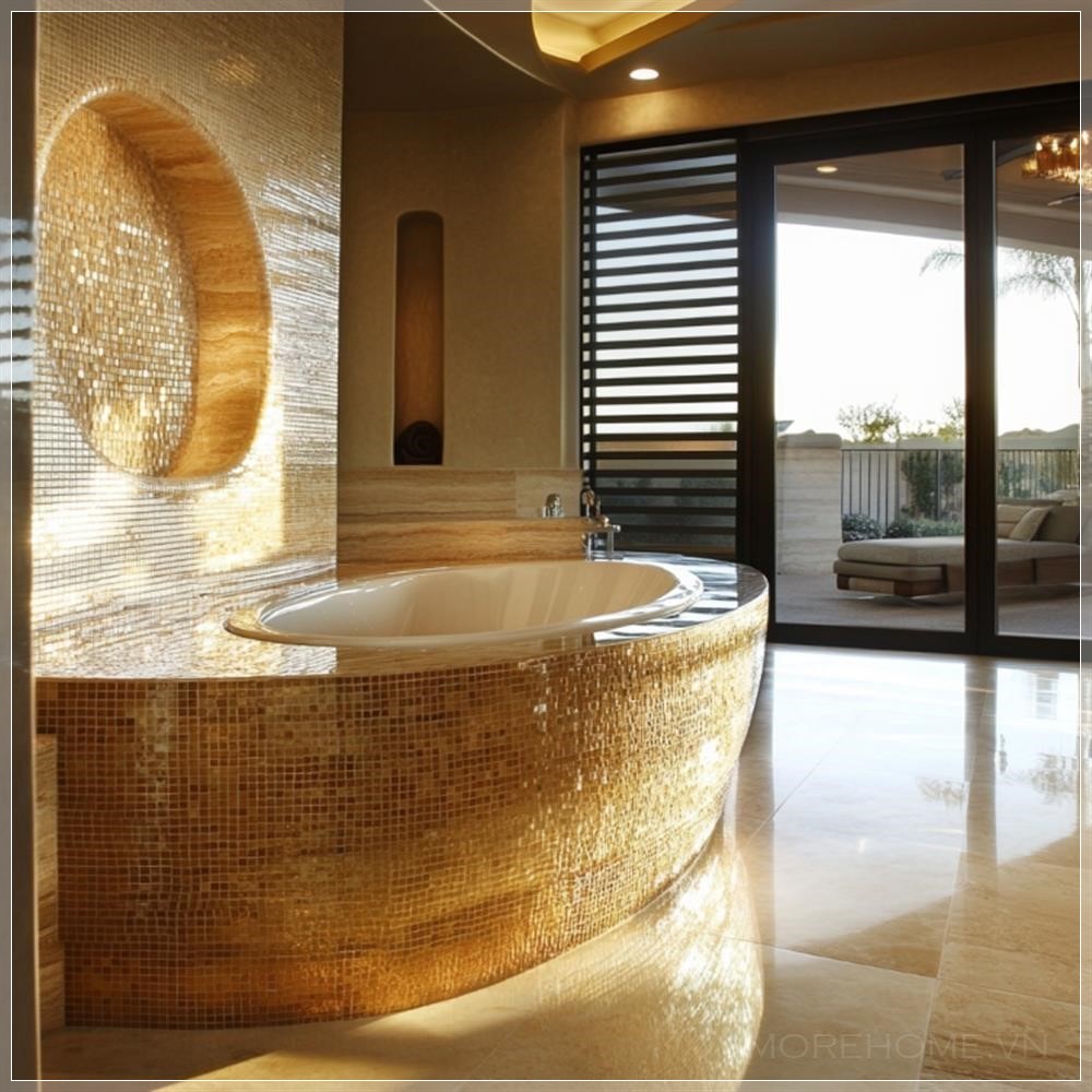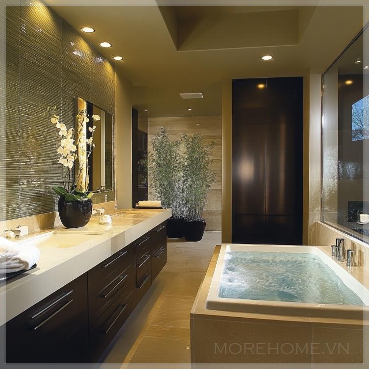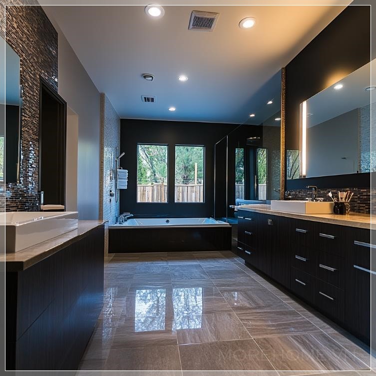 Phòng tắm hiện đại được cải tạo theo phong cách Vegas, kết hợp các yếu tố sang trọng và đương đại, tạo không gian sang trọng với ánh sáng ấm áp và thiết kế ấn tượng, mang đến cảm giác cao cấp và độc đáo cho ngôi nhà.