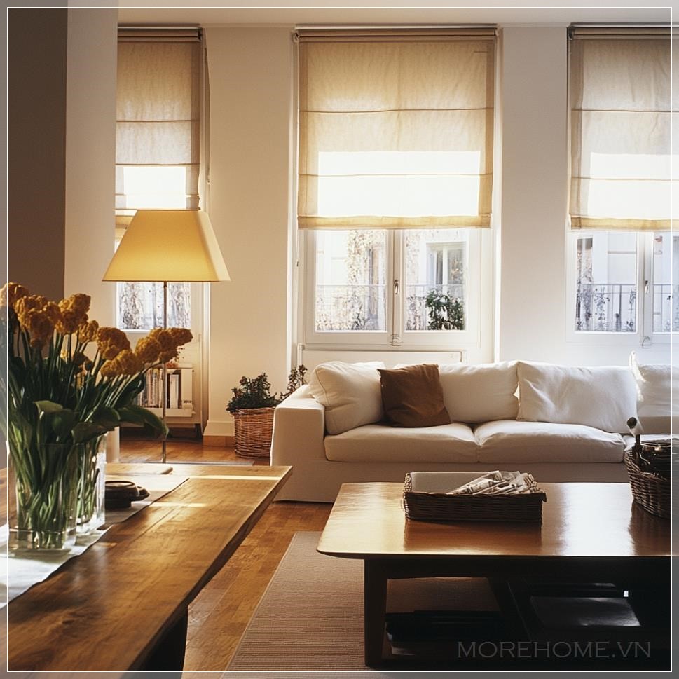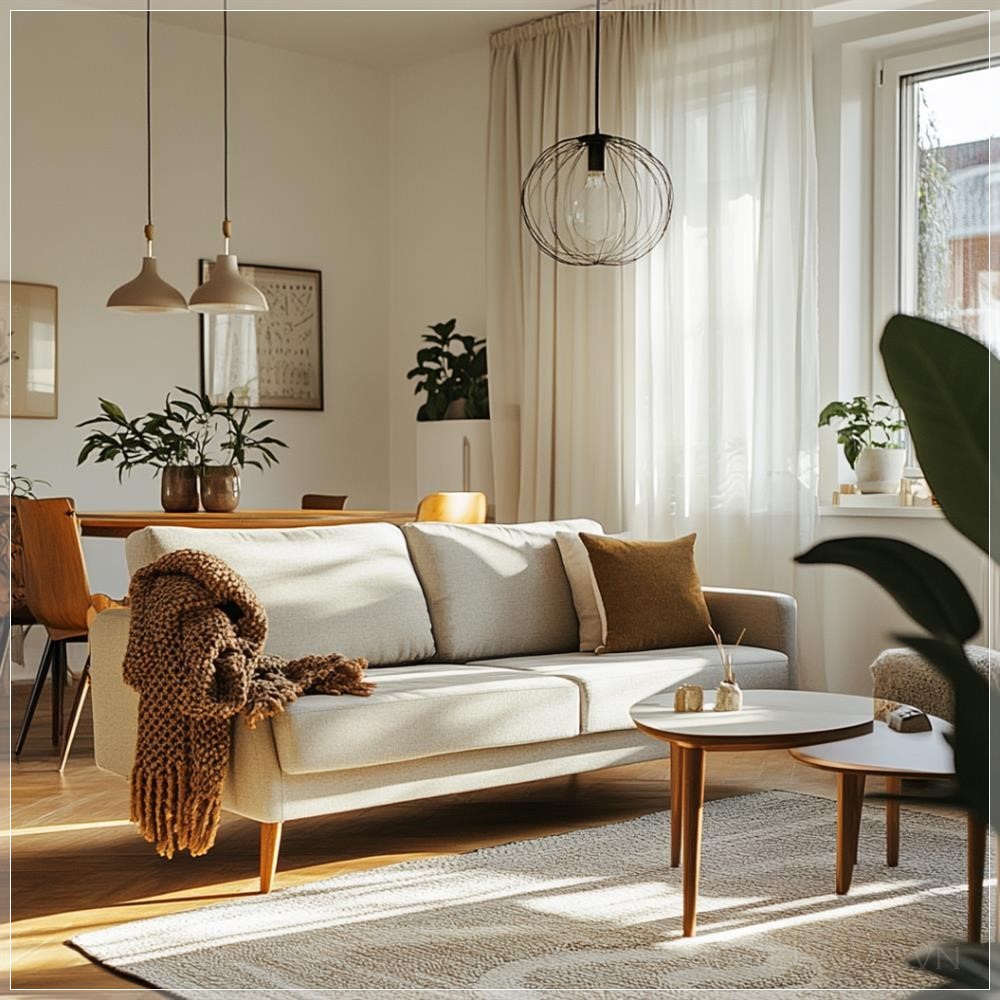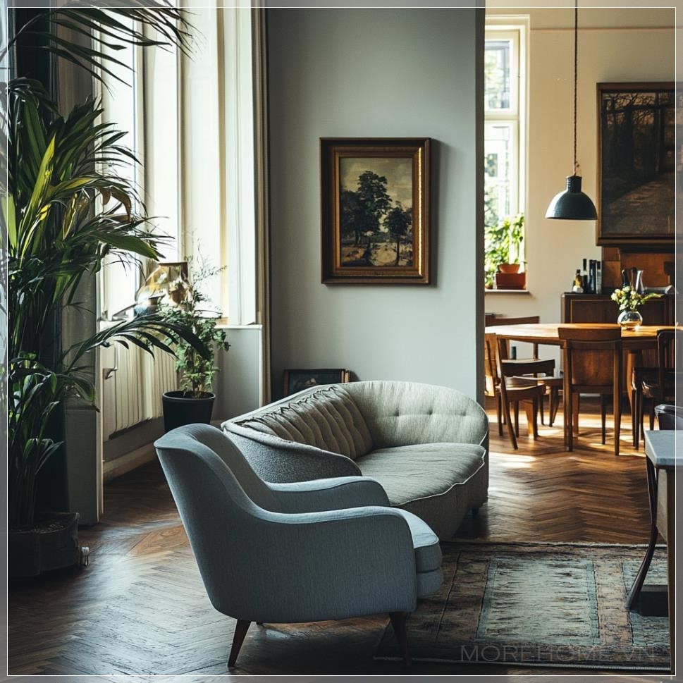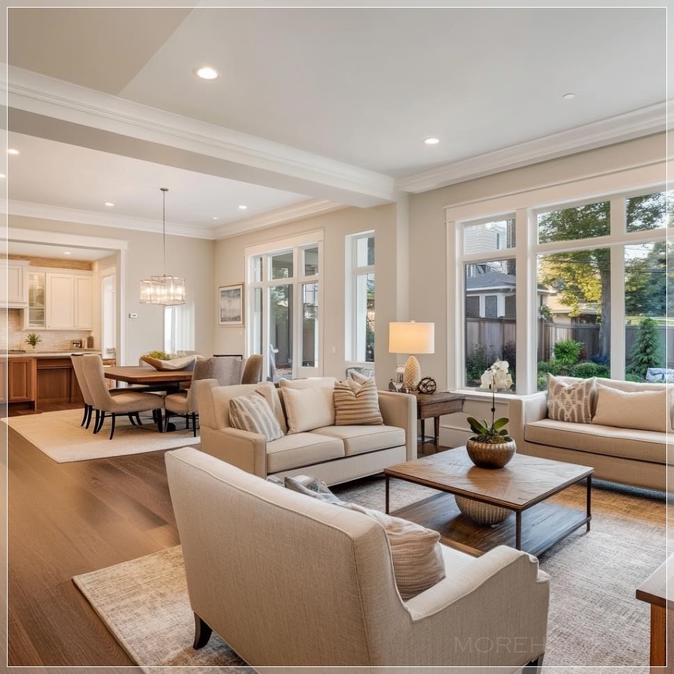 Phòng khách trong ngôi nhà đẹp, với một bàn ăn gần đó, tạo không gian sống ấm cúng và tiện nghi. Không gian này gợi lên sự thoải mái với sự kết hợp giữa các chi tiết trang trí tinh tế và chức năng.