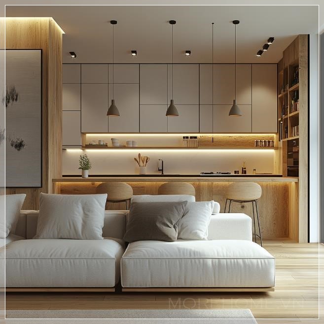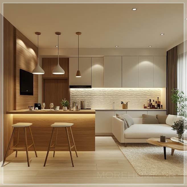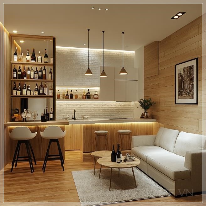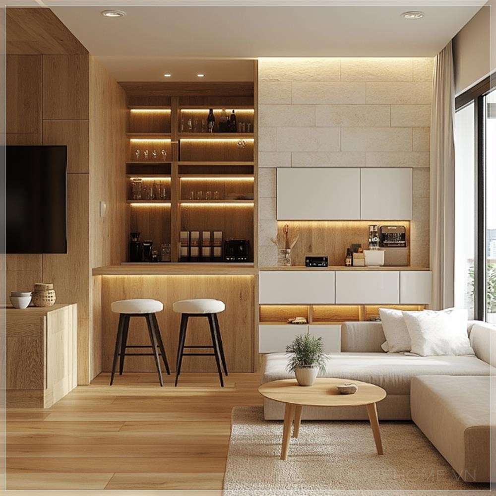 Thiết kế một phòng khách đơn giản cho căn hộ 2 phòng ngủ, với một quầy bar được ốp tường bằng vật liệu có kết cấu đơn giản, sử dụng bảng màu trắng và trắng ngà, điểm nhấn nhẹ nhàng từ gỗ sồi trắng, tạo ra không gian hiện đại và thoải mái.