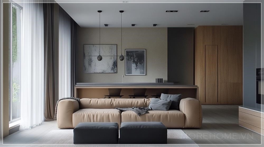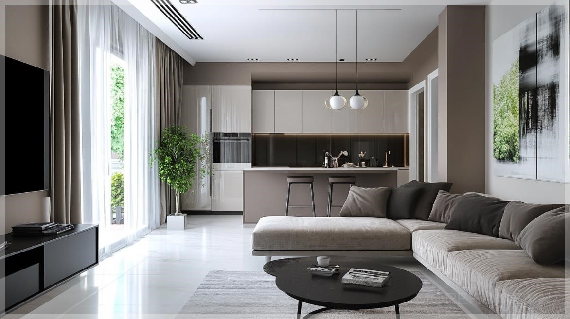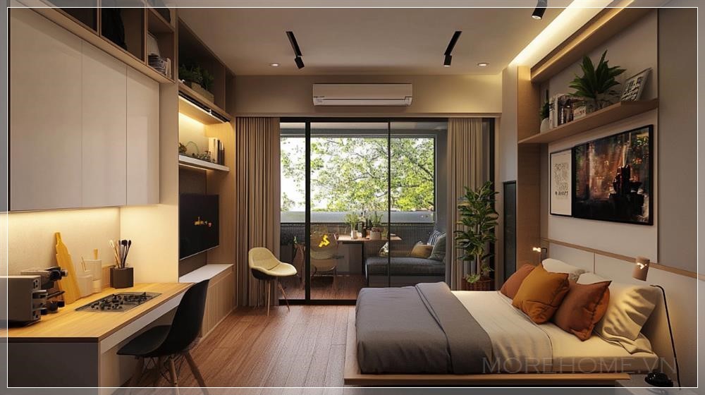Thiết kế nội thất hiện đại với không gian nhỏ, tối ưu hóa sự tiện nghi và phong cách. Các yếu tố như màu sắc trung tính, nội thất đa chức năng, và các chi tiết tinh tế mang đến một không gian sống thoải mái và đầy đủ tiện nghi, hoàn hảo cho các căn hộ hoặc phòng nhỏ.