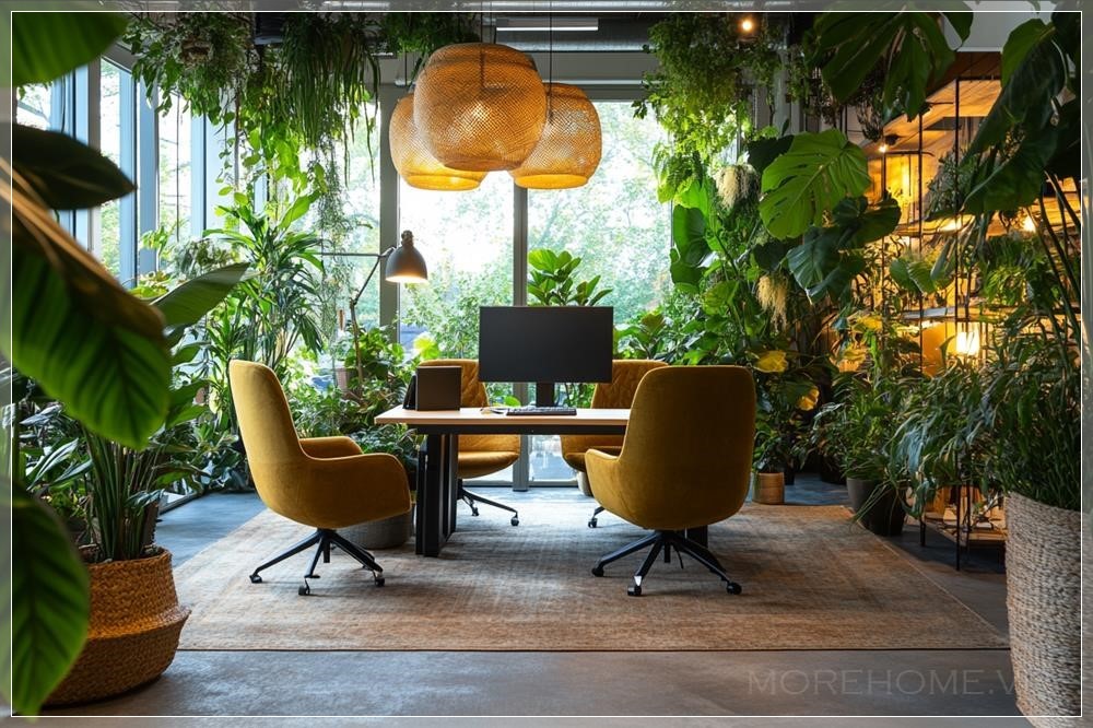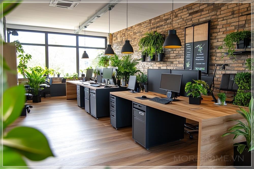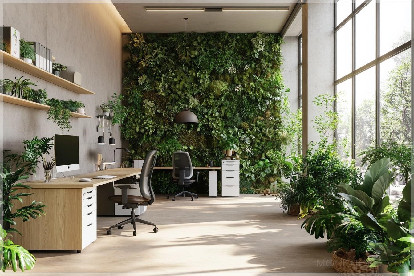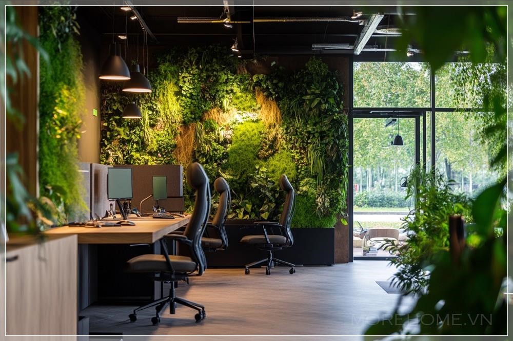 Văn phòng hiện đại với nhiều cây xanh, ánh sáng tự nhiên dồi dào và một bức tường rêu. Không gian được thiết kế để mang lại cảm giác thư giãn và dễ chịu, với sự kết hợp giữa các yếu tố thiên nhiên và ánh sáng, tạo ra một môi trường làm việc thông thoáng và đầy năng lượng. Bức tường rêu không chỉ là điểm nhấn thẩm mỹ mà còn giúp tăng cường sự tươi mới, gần gũi với thiên nhiên trong không gian văn phòng. Các cây xanh được bố trí khắp nơi, góp phần làm sạch không khí và tạo ra một không gian làm việc dễ chịu và sáng tạo.