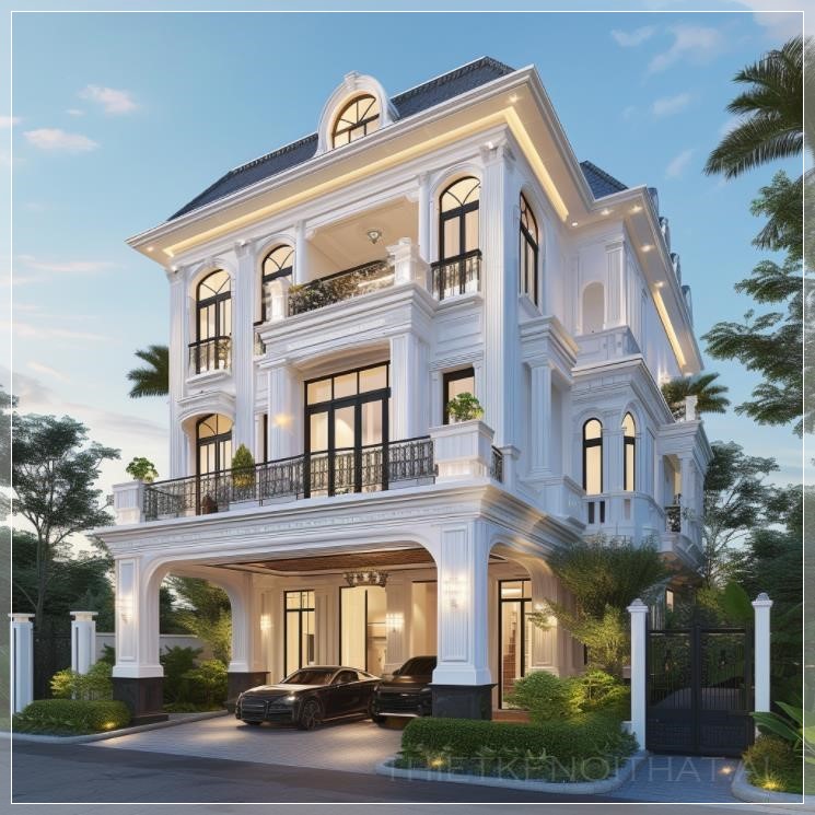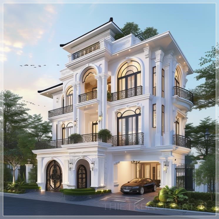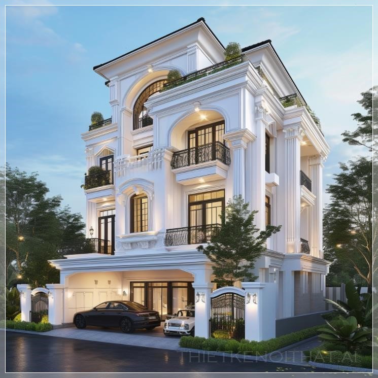 PROMPT: A four story villa with an American style exterior design and white architecture. The second floor is the ground level, and a garage canopy is built outside the second floor --v 6.0 --s 50