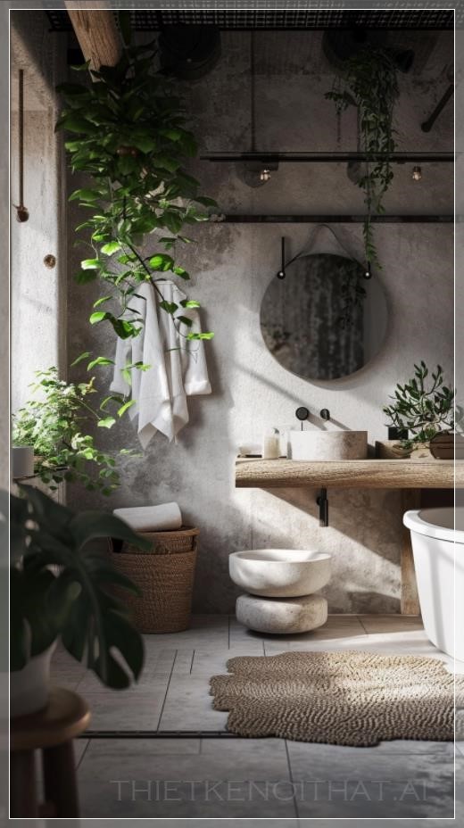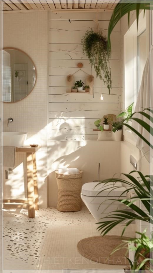 Bathroom Natural elements in Scandinavian style: Get inspired by Scandinavian design by adding natural elements to your bathroom. Use light shades, natural materials such as wood and stone, and an abundance of plants. --ar 9:16 --v 6.0