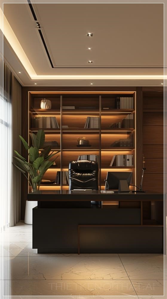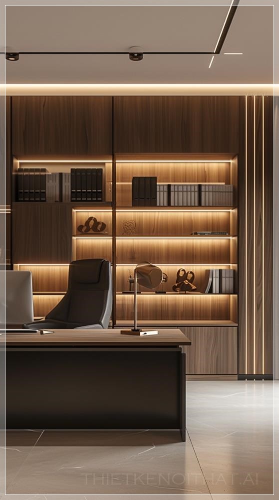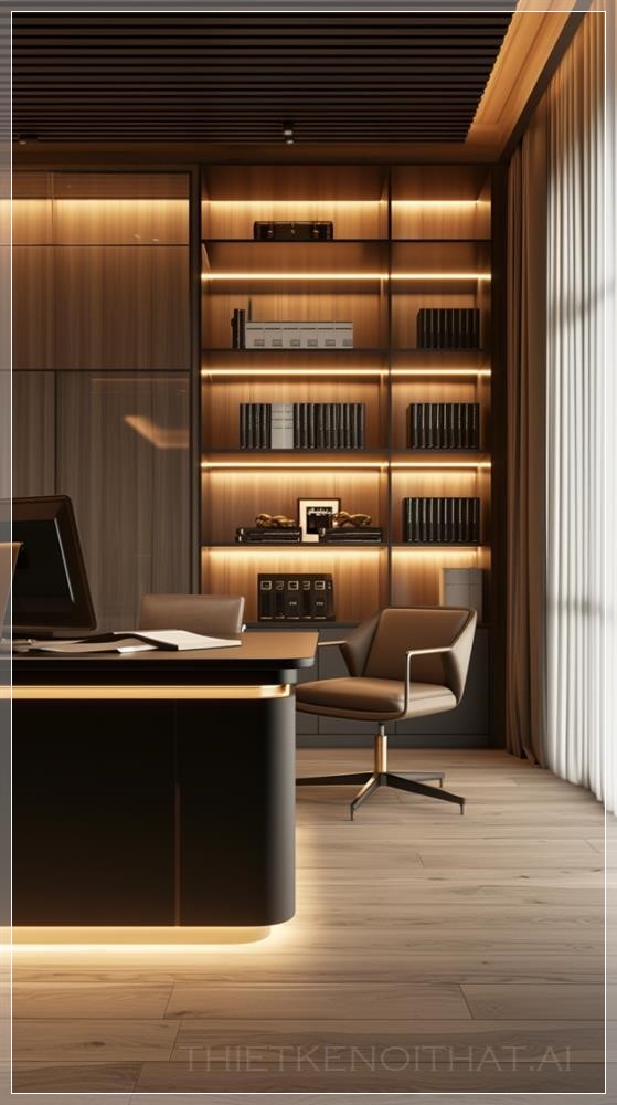 PROMPT: modern office with soft warm lighting and bookcase in the background in the minimalism style --ar 9:16 --v 6.0