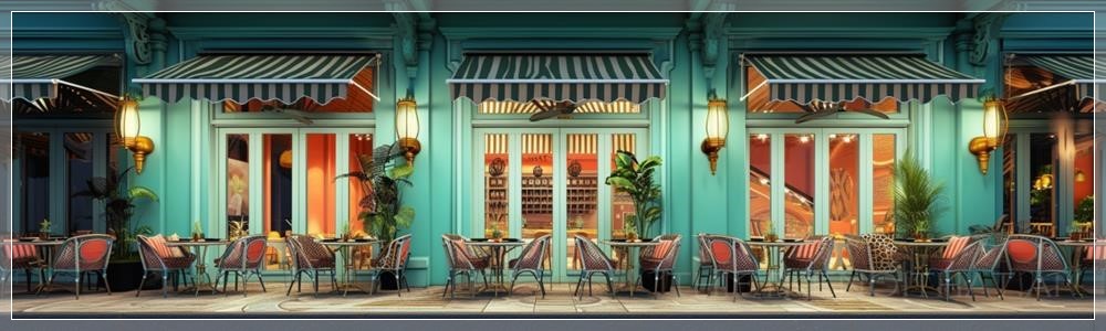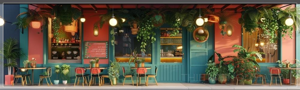 PROMPT: long, seamless shopfront of restaurant and cafes, elevation mapping, flat, extended, cafe with luxury seats and tropical themes, 4K --ar 10:3 --v 6.0 --style raw