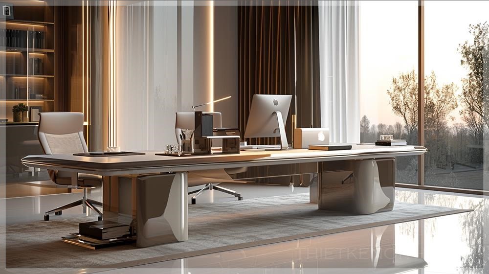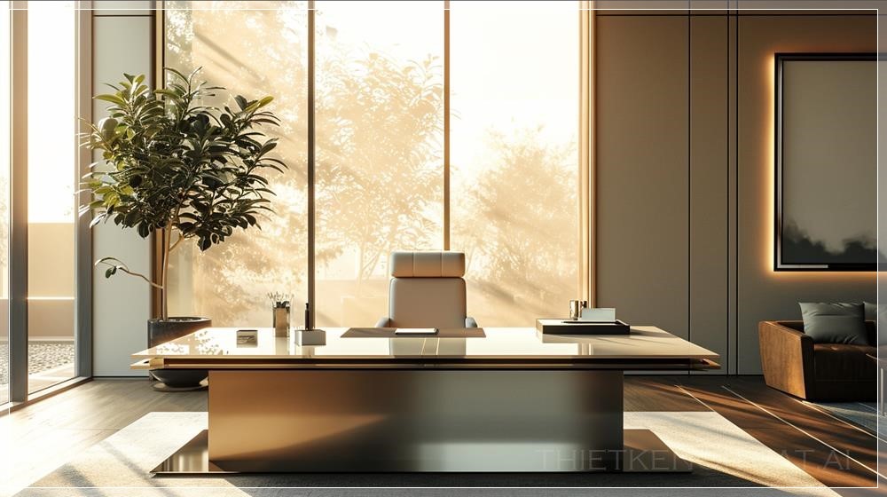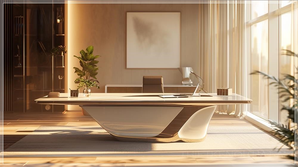 A modern, sleek office desk in a stylish interior. The desk is spacious and elegantly designed, featuring clean lines and a minimalist aesthetic. It's made of high-quality materials like glass or polished wood. The setting is an office or home study room with a sophisticated and contemporary decor. The room has large windows allowing the soft, warm light of the evening sun to filter through, casting gentle shadows and highlighting the desk’s features. The lighting creates a serene and inviting atmosphere, perfect for showcasing a product on the desk. The background should be uncluttered yet visually appealing, with subtle decorations like modern art or indoor plants, to complement the desk without overpowering it. The overall feel of the image is luxurious, professional, and very design-forward, suitable for a high-end product shoot, --v 6.0 --ar 16:9