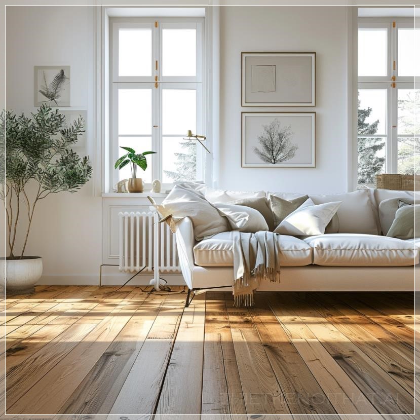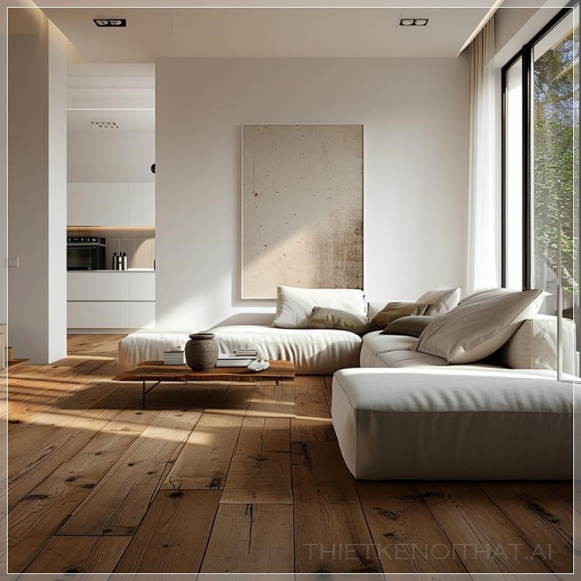 PROMPT: Bright interior, sofa, wooden flooring,Wide view --v 6.0 Ý Nghĩa: