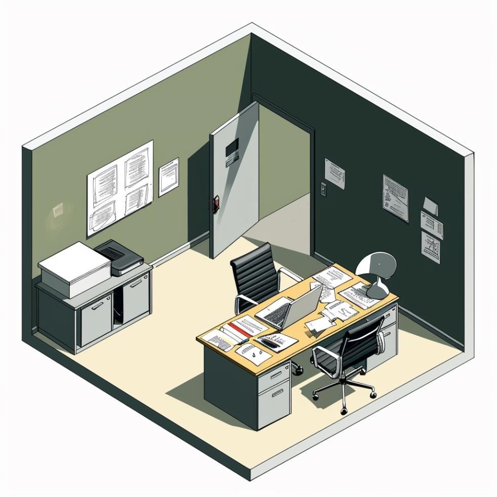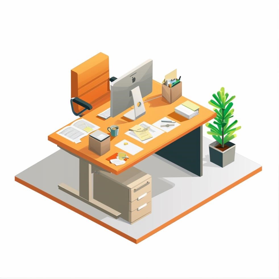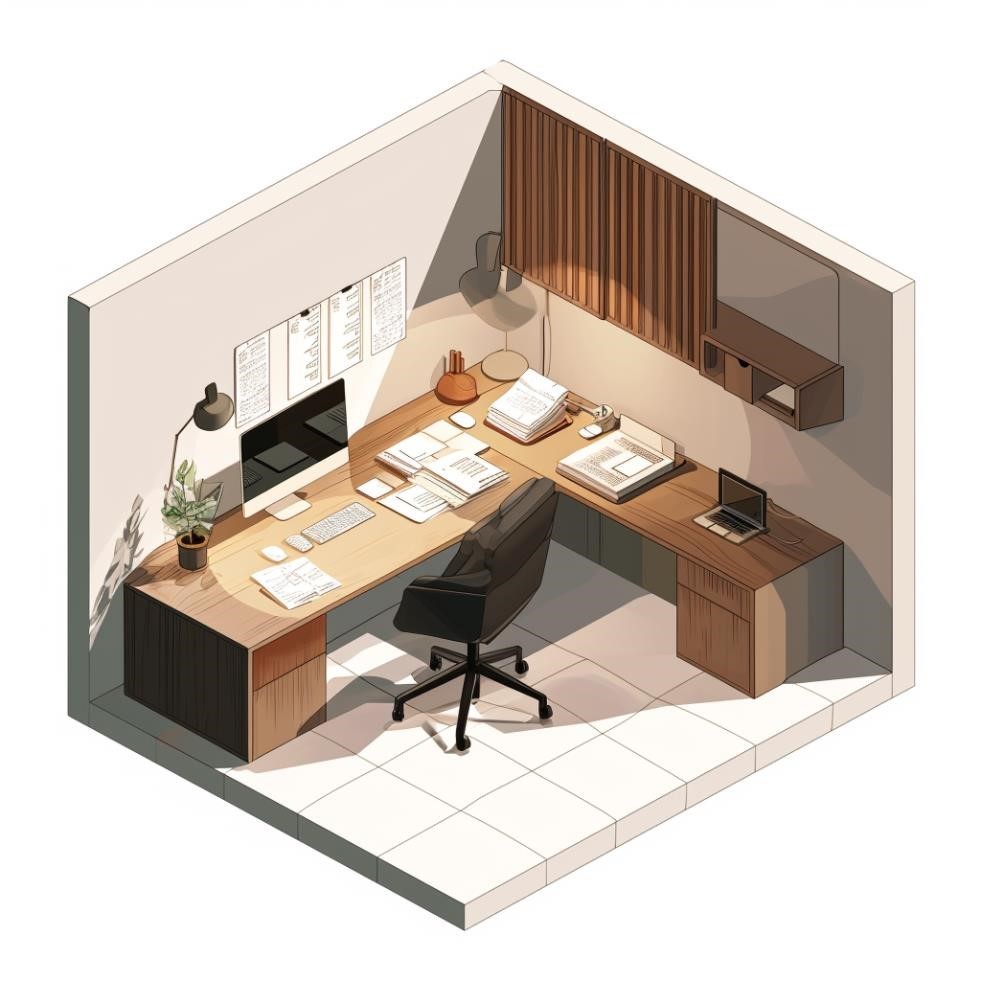 PROMPT: minimalist illustration of an office, desk with papers on it, white background, in the style of Axonometric view --v 6.0 Ý Nghĩa: